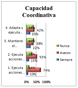 La anterior evaluaci n, complementada con el an lisis del desempe o en los entrenamientos y con los resultados de la encuesta a los entrenadores, permiti comprobar que la capacidad coordinativa de los jugadores se relaciona estrechamente con su rendimiento t cnico-t ctico en la competici n.