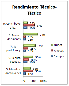 En el tem 8, un 74% de los estudiantes no emite decisiones velozmente y de forma acertada durante el transcurso del juego, revelando una limitaci n en las capacidades de cognici n y en el procesamiento de informaci n en un contexto que es el propio del f tbol. La decisi n es lo que regula tanto la t ctica individual como la colectiva. Cuando hay fallas en este aspecto, significa que los jugadores no est n analizando el juego, anticipando situaciones ni respondiendo bien a los est mulos que surgen durante la competencia.